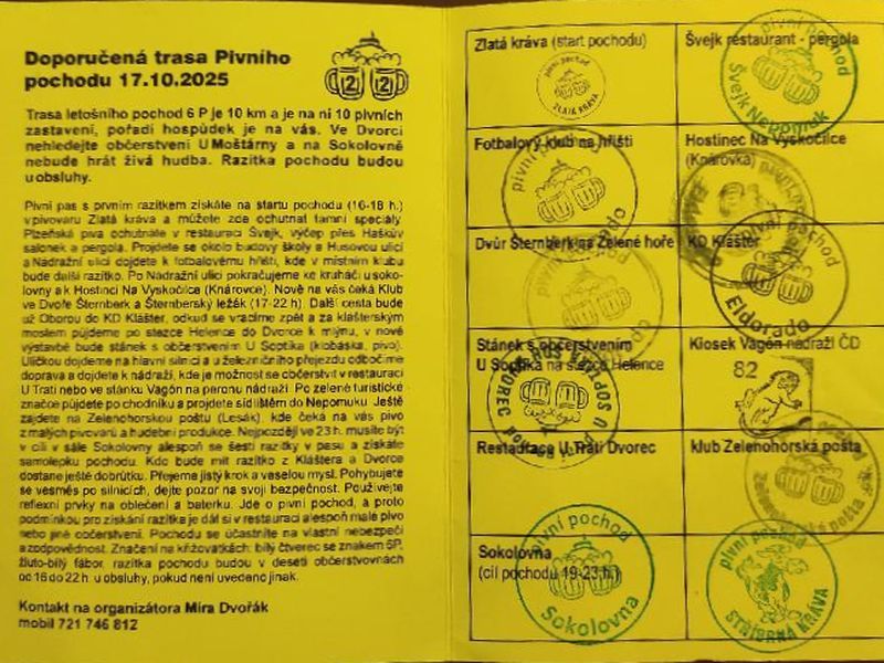 Akce KČT Nepomuk „Podzim pod Zelenou horou“ se konal 17. a 18. října 2025. V pátek se zúčastnili dva členi našeho odboru „Pivního pochodu“. V sobotu nás autobus odvezl do Lovčic a odtud jsme vyrazili na 17 km trasu. První zastávka byla u skalního útvaru Velký kámen, dále jsme pokračovali za chladnějšího počasí přes Kakov do Neuraz. U zámku v Žinkovech jsme se občerstvili a již za slunečného počasí jsme došli ke zřícenině hradu Potštejn a k Žinkovskému templu, napodobenině antického chrámu. Po naučné stezce Klejnot vedla trasa k poslední kontrole u přístřešku Na Čihadle a dále po zelené do cíle v nepomucké Sokolovně. Sobotního pochodu se zúčastnilo šest členek našeho odboru.
